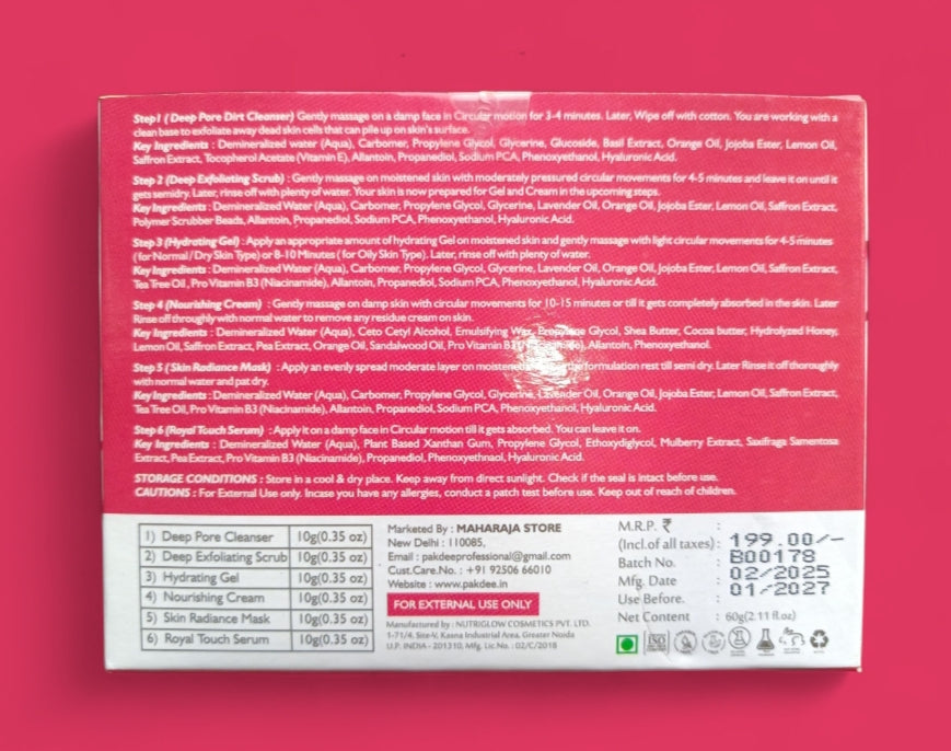 Facial Kit- PAK DEE Professional's Insta Glow Youth Revitaleft 6in1 (Cleanser+Scrub+Hydrating Gel+Nourishing Cream+Masque+Serum) Skin Radiance Facial Kit 60gm (10gm*6)