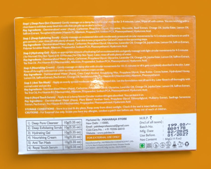Facial Kit- PAK DEE Professional's Tan Corrector Whitening Glow 6in1 (Cleanser+Scrub+Hydrating Gel+Nourishing Cream+Masque+Serum) Anti Tan (SPF30++) Facial Kit 60gm (10gm*6)