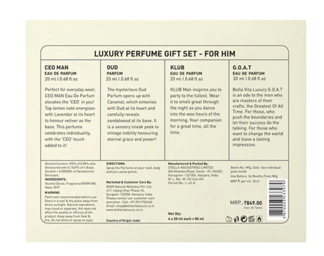 Perfumes & Deodorants- Bella Vita Luxury Long Lasting Unisex Perfume Gift Set 20mlx4 (SKAI, FRESH, WHITE OUD, HONEY OUD) for Man & Woman.