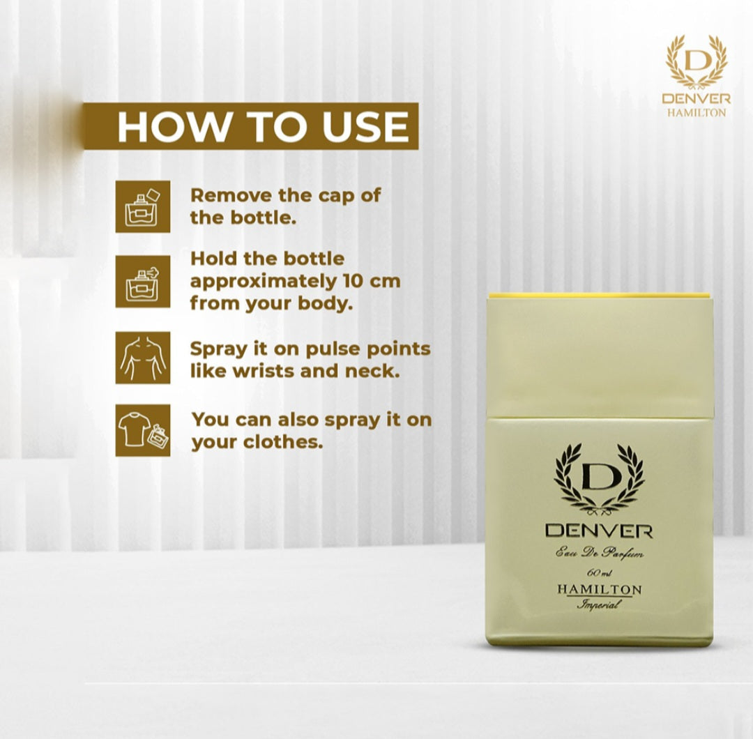 Experience the luxurious scent of DENVER IMPERIAL Natural Perfume Spray. Made with natural ingredients, this spray leaves a long-lasting and refreshing fragrance. Elevate your senses with this natural perfume, perfect for any occasion.